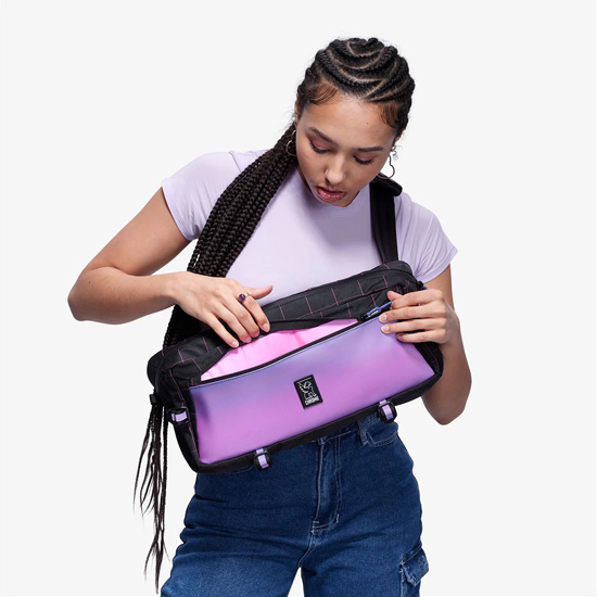 些細な空気抵抗をも意識して、4か所のコンプレッションパーツで荷物量に合わせたバッグの容量調節や