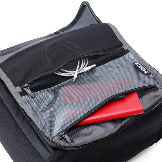 開くと現れる上下からアクセス可能な伸縮ポケットは周辺機器の収納に最適。