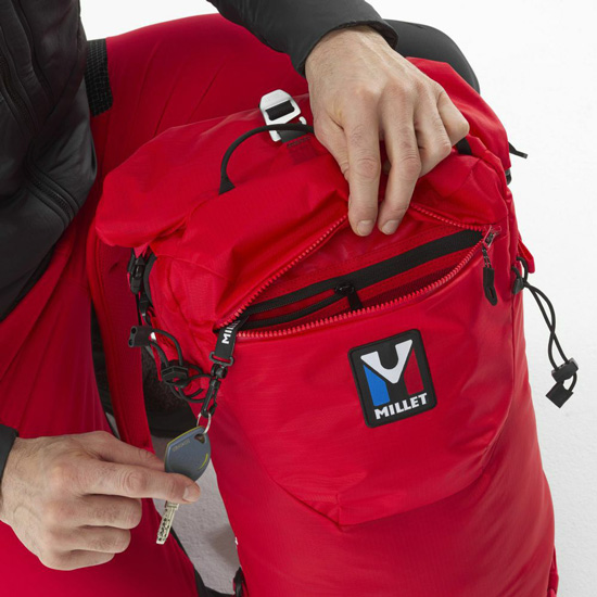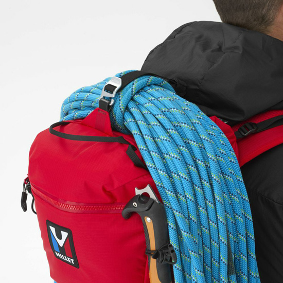 開口部は拡張性の高いロールトップ型で、ロープホルダーやアイスアックスホルダー、スキーホルダー