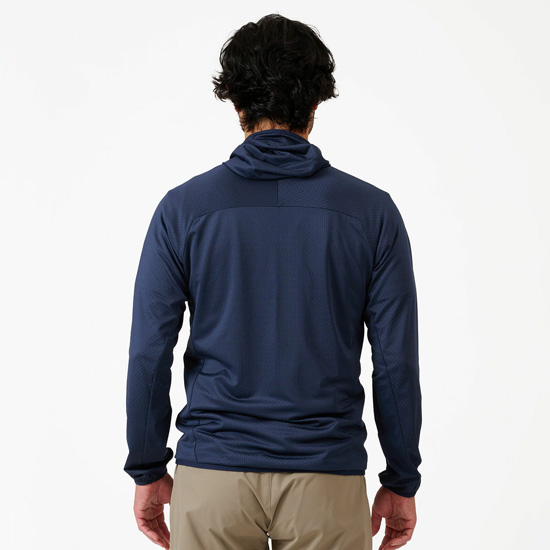 頭にフィットするバラクラバタイプのフードや、肩の縫い目を避けたラグランスリーブの裁断など、登山をはじめとしたアウトドアではもちろん、デイリーユースでも快適な使い心地を提供します。