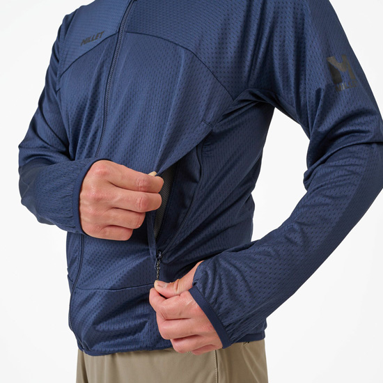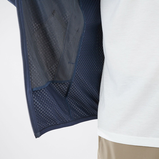 メッシュ構造で微細な凹凸模様の薄手フリース生地は適度な断熱性と優れた通気性を備え、衣服内を温めすぎず、そしてかいた汗を素早く拡散し、常にドライを保つのに役立ちます。